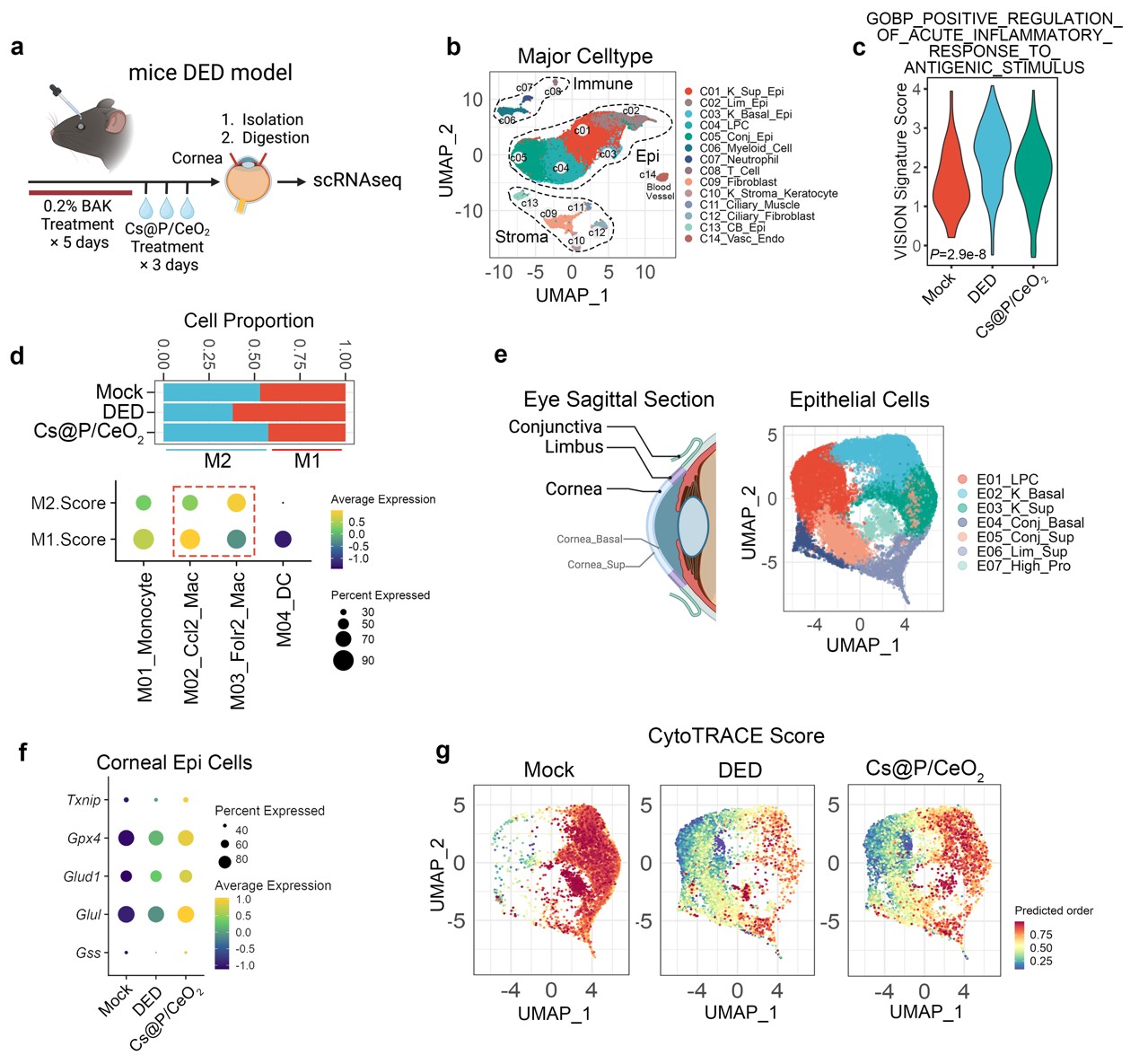 為了闡明Cs@P/CeO2治療干眼的具體機制,研究者對小鼠角膜采用單細胞測序技術擬從單個細胞層面描繪納米酶材料對眼表微環(huán)境的影響。單細胞測序數據發(fā)現Cs@P/CeO2可以通過重塑免疫細胞與上皮細胞穩(wěn)態(tài),建立M2型巨噬細胞優(yōu)勢的眼部微環(huán)境,抑制局部炎癥反應,并促進角膜上皮的再生,調節(jié)免疫細胞與上皮細胞之間的互作,進而重建干眼癥模型中的角膜微環(huán)境。