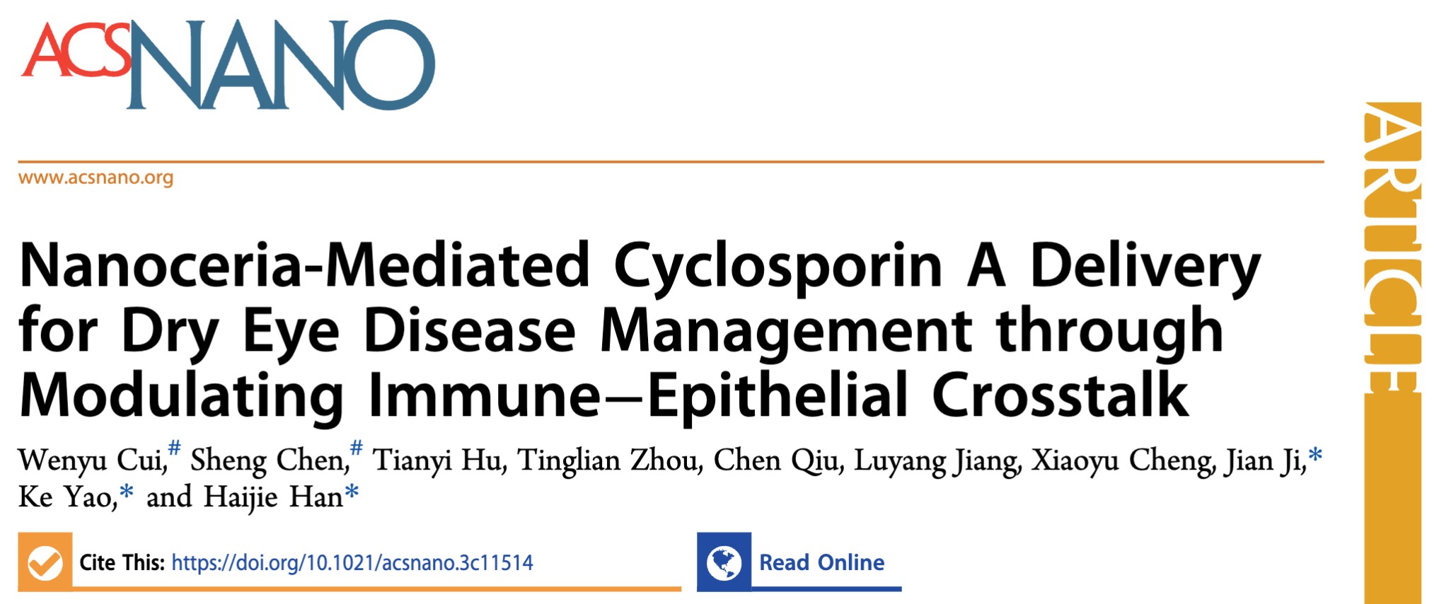 [1] Cui W, Chen S, Hu T, Zhou T, Qi C, Jiang L, Cheng X, Ji J, Yao K, Han H. Nanoceria-Mediated Cyclosporin A Delivery for Dry Eye Disease Management through Modulating Immune-Epithelial Crosstalk. ACS Nano. 2024, 18, 17, 11084–11102