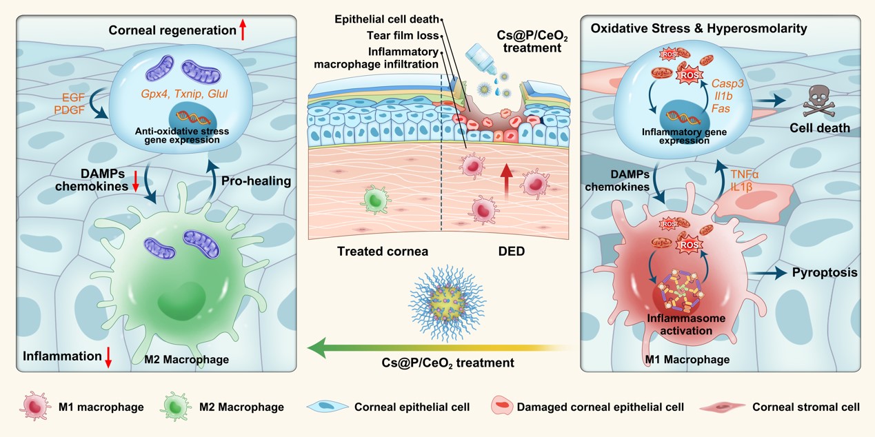 近日,浙江大學眼科醫(yī)院(浙江大學醫(yī)學院附屬第二醫(yī)院眼科中心)韓海杰研究員、姚克教授、計劍教授團隊在國際權威期刊ACS Nano (IF: 17.1)發(fā)表了題為“Nanoceria-Mediated Cyclosporin A Delivery for Dry Eye Disease Management through Modulating Immune-Epithelial Crosstalk”的一項研究。該研究報道了一種負載環(huán)孢素A的納米氧化鈰滴眼液(Cs@P/CeO2),具有長效的抗炎和抗氧化能力,進而通過調節(jié)免疫-上皮互作治療干眼[1]。