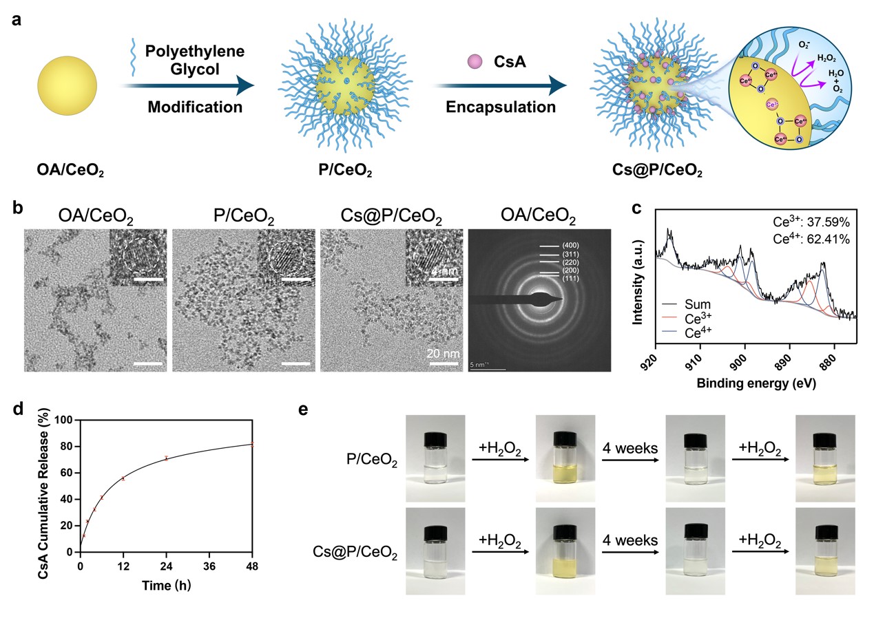 為了靶向干眼微環(huán)境中氧化應激-炎癥這一惡性循環(huán),本研究以具有可再生抗氧化能力的納米氧化鈰材料為骨架[2],在表面修飾聚乙二醇,構建了負載環(huán)孢素A的納米酶滴眼液(Cs@P/CeO2)。并通過一系列材料表征實驗,證明制備的高親水性材料呈現出均一的立方納米結構,同時具備可再生的抗氧化能力與緩慢釋放環(huán)孢素A的效果。