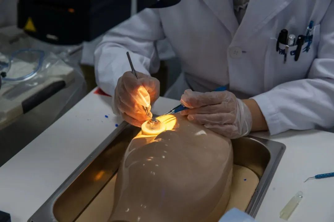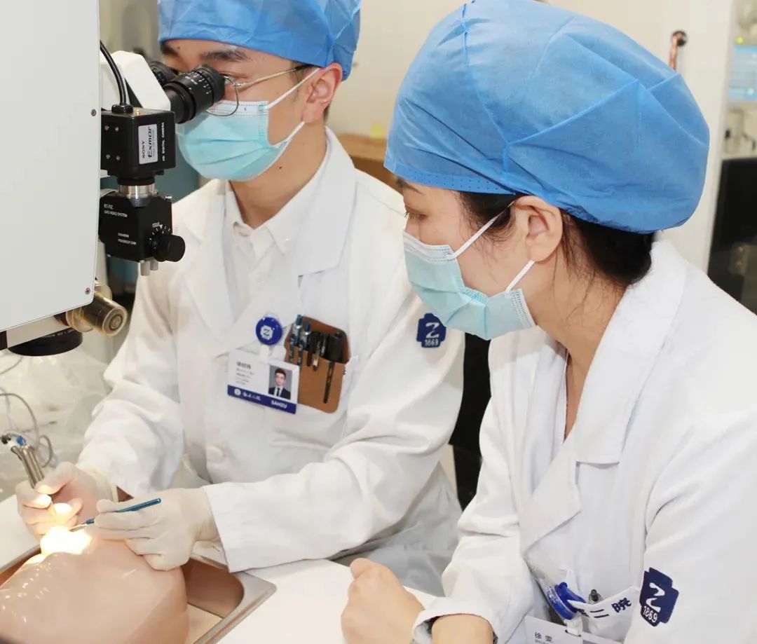 徐雯教授指導(dǎo)青年醫(yī)生進行豬眼實操訓(xùn)練