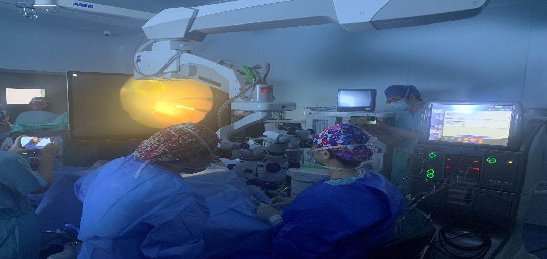 手術(shù)由方肖云教授主刀,陳芝清主任醫(yī)師擔(dān)任一助,吳世靖博士擔(dān)任二助,在玻璃體手術(shù)后給患者進(jìn)行視網(wǎng)膜下給藥,手術(shù)進(jìn)行非常順利,一次給藥完成。親臨手術(shù)室給予現(xiàn)場(chǎng)指導(dǎo)的國(guó)家眼科臨床醫(yī)學(xué)中心、上海交通大學(xué)附屬第一醫(yī)院眼科孫曉東教授予以高度贊揚(yáng)和肯定。