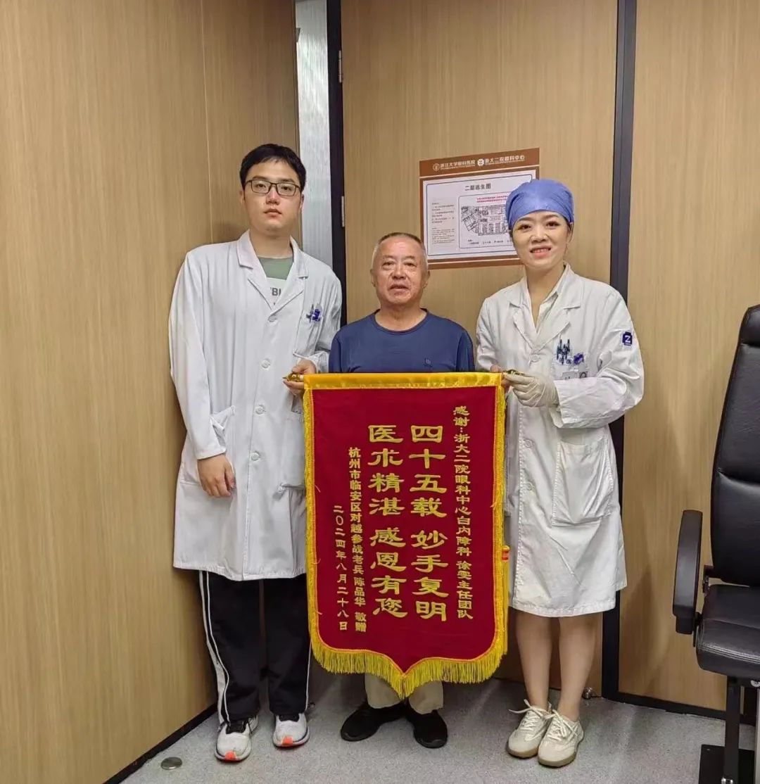 復查時陳大伯向徐雯醫(yī)生和團隊鄭重獻上錦旗:四十五載 妙手復明 醫(yī)術(shù)精湛 感恩有您!