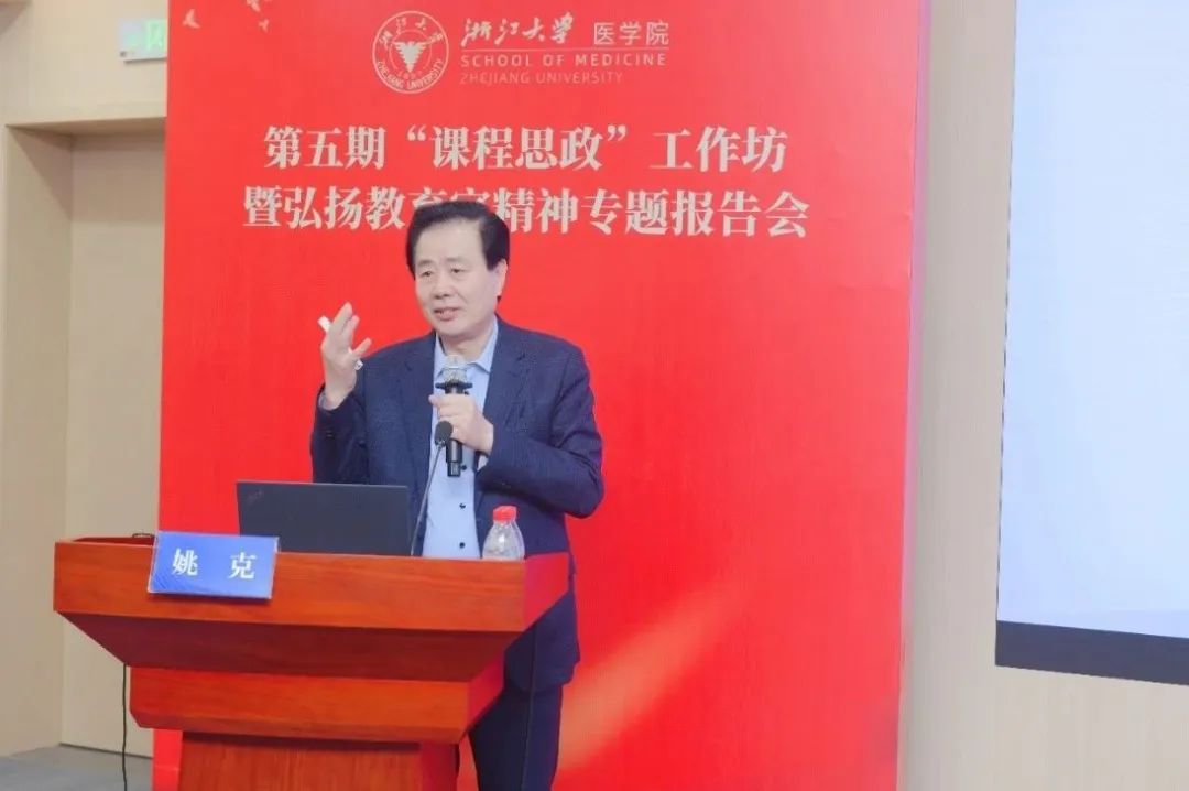 為推進(jìn)落實(shí)教育部《關(guān)于加強(qiáng)和改進(jìn)新時(shí)代師德師風(fēng)建設(shè)的意見》和《浙江大學(xué)關(guān)于進(jìn)一步推進(jìn)課程思政建設(shè)的實(shí)施方案》等文件精神,深入學(xué)習(xí)《中共中央國(guó)務(wù)院關(guān)于弘揚(yáng)教育家精神 加強(qiáng)新時(shí)代高素質(zhì)專業(yè)化教師隊(duì)伍建設(shè)的意見》,全面提升教師隊(duì)伍的思想政治素質(zhì)和教育教學(xué)能力,近日,浙江大學(xué)醫(yī)學(xué)院舉辦第五期“課程思政”工作坊暨“弘揚(yáng)教育家精神”專題報(bào)告會(huì)?;顒?dòng)特邀浙江大學(xué)眼科醫(yī)院、浙江大學(xué)醫(yī)學(xué)院附屬第二醫(yī)院眼科中心主任姚克教授作專題報(bào)告。醫(yī)學(xué)院黨委常務(wù)副書記兼副院長(zhǎng)夏標(biāo)泉出席會(huì)議并致辭,報(bào)告會(huì)由醫(yī)學(xué)院副院長(zhǎng)樓敏主持。