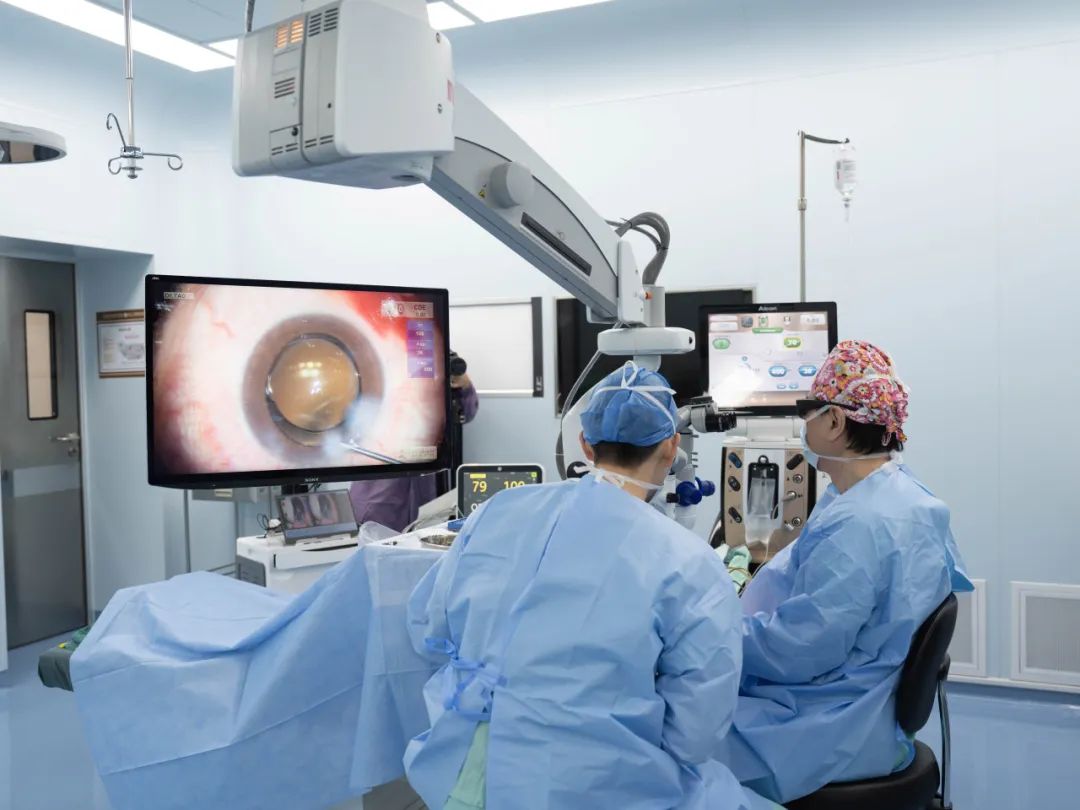 姚克教授(右一)主刀國內(nèi)首例全新材質(zhì)景深延長型人工晶狀體植入手術(shù)