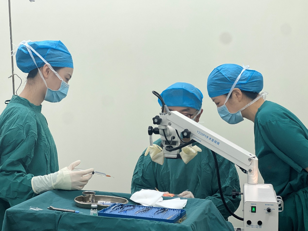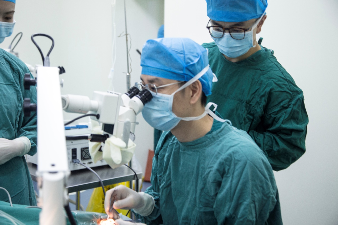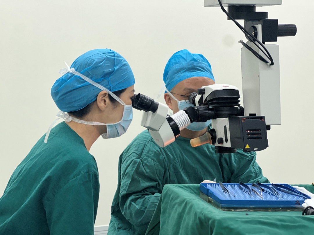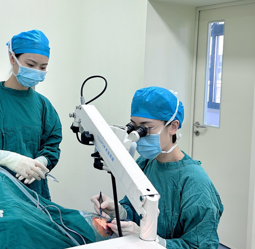 徐雯教授(左)指導開化縣人民醫(yī)院洪小剛副主任醫(yī)師做手術